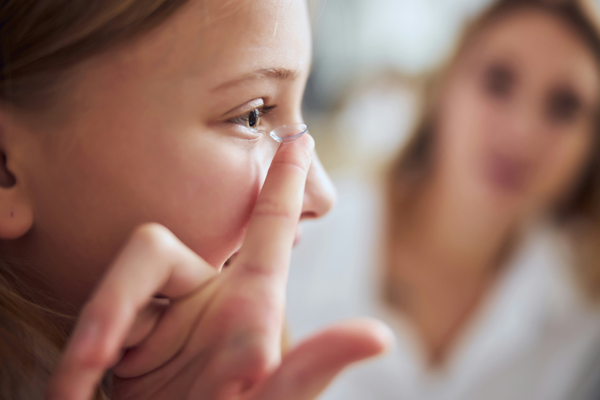 Linserne sættes i ved at placere dem på pegefingeren og føre dem forsigtigt ind på øjet, hvorefter de justeres ved at blinke, så de sidder korrekt på hornhinden.